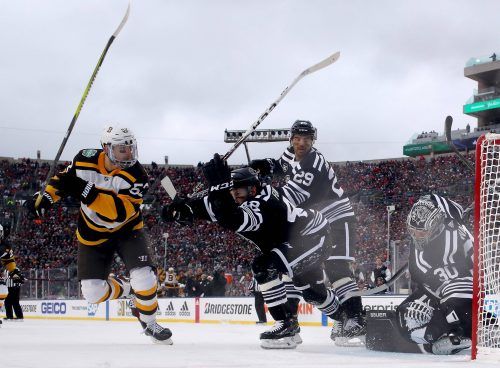 Im Januar, wenn es idealerweise klirrend kalt ist, geht es für einige Eishockeyspieler nach draußen. In der NHL ist das „Winter Classic“ das große Ereignis, 76 126 Zuschauer wurden im Stadion der University of Notre Dame gezählt, als die Chicago Blackhawks (dunkle Trikots, mit u. a. Dominik Kahun, d