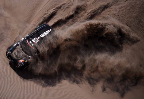 Der Spanier Nani Roma (Foto: AFP) wirbelte in den Dünen von Tanaka in Peru mit seinem Mini eine Menge Staub auf. Auf der sechsten Etappe der Rallye Dakar fuhr der 46-jährige Katalane auf den 4. Platz, in der Gesamtwertung nimmt er den 5. Rang auf. Weiter in Führung liegt der Katarer Nasser Al-Attiya