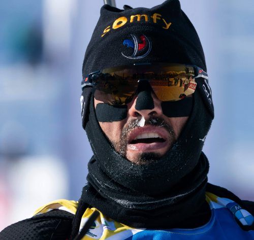 Die arktische Kälte zwingt die Biathleten im kanadischen Canmore derzeit zu Spezialmaßnahmen (im Uhrzeigersinn): Laura Dahlmeier atmet durch ein Gerät, eine nicht identifizierbare Norwegerin, Italiens Lisa Vittozzi und der Franzose Simon Fourcade schützen sich mit Masken. Fotos: afp