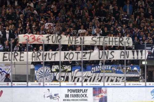 Die aus München angereisten Damen und Herren waren hochgradig empört. Und entschlossen, ihrer Verärgerung Ausdruck zu verleihen. Als das Eishockey-Playoff-Spiel zwischen den Augsburger Panthern und dem EHC München losging, hielten sie DIN-A4-Blätter in die Höhe. Um den Wucher Augsb
