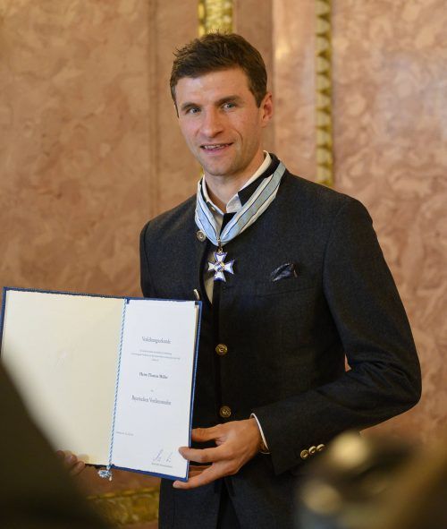 München – Thomas Müller kam zur Verleihung des Bayerischen Verdienstordens standesgemäß im feschen Trachtenjanker. Begleitet wurde er zur feierlichen Zeremonie in den Marmorsaal des Prinz-Carl-Palais von Ehefrau Lisa und seinen Eltern Klaudia und Gerhard. Als Müller seinen Platz in