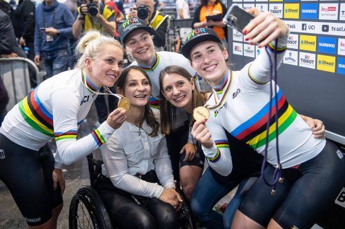 BAHNRAD Kristina Vogel freut sich mit den deutschen Überraschungs-Weltmeisterinnen