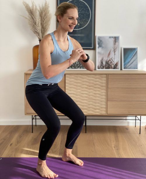 Kati Utz macht es vor. Sie fängt an mit Übung 1 – der dynamischen Kniebeuge. Ihre Tipps: Hüftbreiter Stand, Po absenken und Knie beugen, Bauchnabel einziehen und Rücken gerade halten, Beine wieder strecken. Übung 2 nennt sich Rollup: Rückenlage, Beine so gestreckt wie möglich anheben, Oberkörper a
