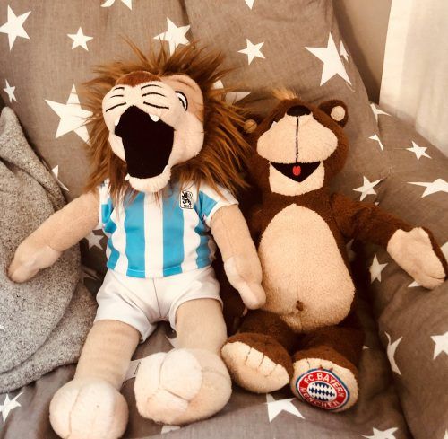 Ja, sie sind heute in einem Bett aufgewacht. „Berni“, der Bayern-Bär, und „Sechzger“, der 1860-Löwe. Als ich das Zimmer meines Sohnes – gewissermaßen das Spielfeld unseres hausinternen Derbys – betrat, lagen sie ganz friedlich nebeneinander, von Rivalität keine Spur. Und irgendwie, das muss ich zuge