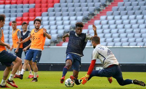 Zur Sache ging’s beim Training des FC Bayern München in der Allianz Arena. In der Heimstätte der Münchner wurde der Ernstfall für den Re-start der Bundesliga am kommenden Sonntag bei Union Berlin geübt – also auch mit vollem Körpereinsatz. Auf unserem Foto grätscht Keeper Sven Ulreich dem Angreifer