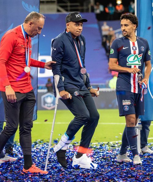 Paris – Auch Staatspräsident Emmanuel Macron wollte von Kylian Mbappé wissen, wie es ihm geht. Bei der Siegerehrung nach dem französischen Pokalendspiel erkundigte sich Macron beim Weltmeister, der sich nach dem 1:0-Sieg über AS Saint-Etienne am Freitagabend an Krücken zur Zeremonie im Stade de Fran