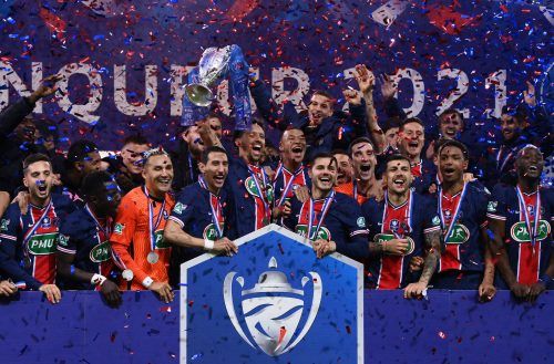 Paris St. Germain hat gegen Ex-Bayern-Trainer Niko Kovac und AS Monaco den französischen Fußball-Pokal erfolgreich verteidigt – auf dem Bild präsentiert PSG-Kapitän Marquinhos die Trophäe. Ohne den gesperrten Superstar Neymar gewann die Mannschaft von Trainer Mauricio Pochettino im Finale 2:0 gegen