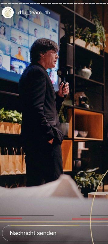 Gebannt lauschten Spieler, Trainer und DFB-Mitarbeiter den Worten von Adidas-Vorstandschef Kasper Rorsted, als er die Nationalmannschaft im „Home Ground“ begrüßte. Bundestrainer Joachim Löw (ganz links) griff ebenfalls zum Mikrofon und bedankte sich im Namen der Mannschaft für die Gastfreundschaft.