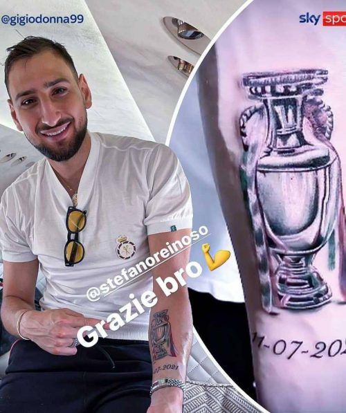 Italiens EM-Held Gianluigi Donnarumma muss sich nie mehr von der Trophäe trennen, die er mit der Squadra Azzurra im Finale im Wembleystadion gegen England errungen hat. Der Torwart trägt den Pokal jetzt nämlich als Tattoo auf dem linken Unterarm. Ein bisschen musste er dafür auf die Zähne beißen, wi