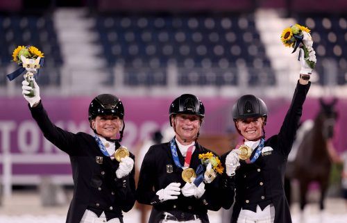 Tokio – Isabell Werth strahlte bereits, bevor das Ergebnis offiziell auf der Anzeigetafel leuchtete. Die 52 Jahre alte Rekordreiterin feierte in Tokio mit dem deutschen Dressur-Dreamteam erneut olympisches Gold. Gemeinsam mit Dorothee Schneider und Jessica von Bredow-Werndl siegte sie überlegen und