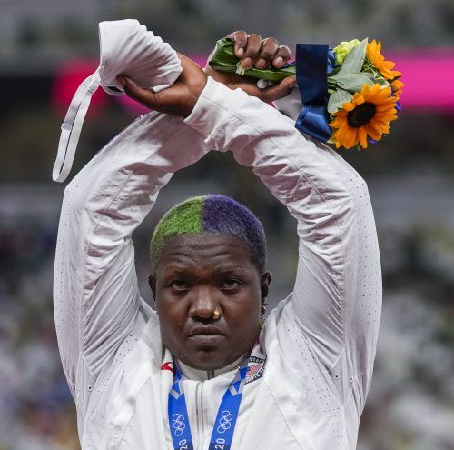 Der amerikanischen Kugelstoßerin Raven Saunders (Foto: dpa/Francisco Seco) könnte die erste Strafe wegen eines „politischen“ Protests bei einer Siegerehrung drohen. Die 25-Jährige, die am Sonntag Silber gewonnen hatte, kreuzte auf dem Podium ihre über den Kopf erhobenen Arme. Mi