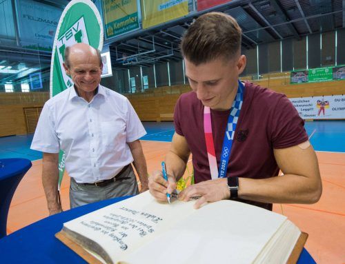 Tiefenentspannt hat Vizeolympiasieger Lukas Dauser (r.) beim Empfang seines Heimatvereins TSV Unterhaching Autogramme gegeben, für Fotos posiert und sogar seine Silbermedaille aus Tokio dem einen oder anderen Nachwuchsturner in die Hand gedrückt. Allein umhängen durfte die Plakette niemand – „das br