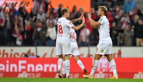 Sebastian Andersson (r.) und Ondrej Duda klatschen sich ab. Ihr 1. FC Köln ist nicht aus der Erfolgsspur zu bringen. Das Freitagabendspiel der Bundesliga gewann die Mannschaft des wieder mit Schiebermütze angetretenen Trainers Steffen Baumgart gegen Aufsteiger SpVgg Greuther Fürth mit 3:1 (0:1).