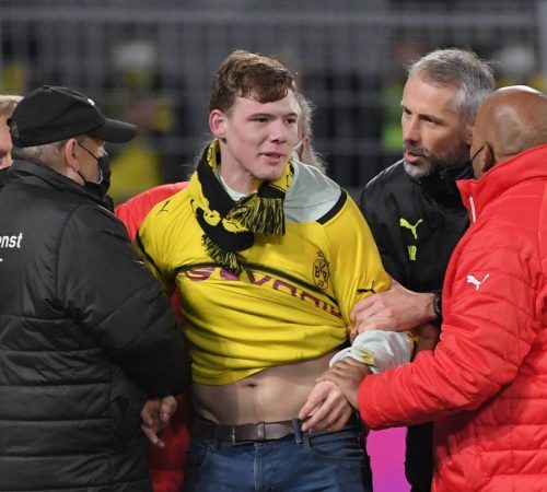 Marco Rose (im Bild rechts/Foto: Imago) führte den neuesten Flitzer bei Borussia Dortmund höchstpersönlich vom Feld. Der BVB-Trainer sieht in den Fans, die in ihrer Euphorie auf den Rasen rennen, einen besorgniserregenden Trend. „Das sollte nicht exponentiell explodieren, dass jedes Spiel drei oder