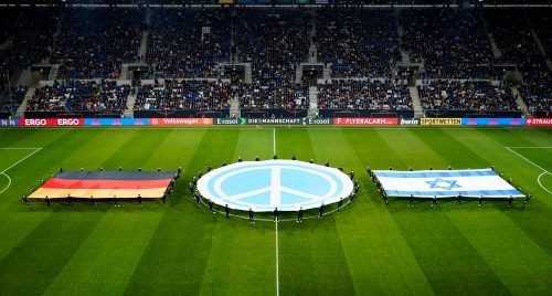 Klare Botschaften: Die Fußball-Nationalmannschaften Deutschlands und Israels sowie die Zuschauer im Stadion von Sinsheim setzen am Samstag vor dem Länderspiel der beiden Teams Zeichen für den Frieden. Vor der Partie wurde auf dem Rasen zwischen den Nationalflaggen ein großes Peace-Zeichen präsentier