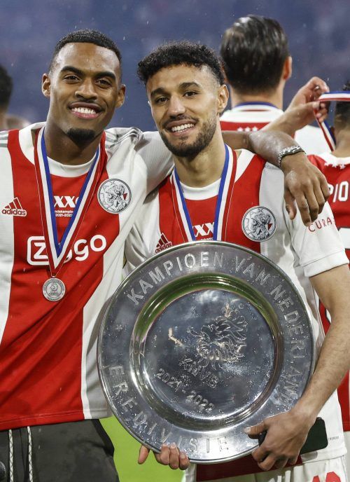 In München wird ab kommender Saison wieder Niederländisch gesprochen. Nach dem bereits feststehenden Wechsel von Ajax-Rechtsverteidiger Noussair Mazraoui (24/r.) zum FC Bayern scheint nämlich auch mit seinem Teamkollegen Ryan Gravenberch (l.) alles klar zu sein. Das plauderte jedenfalls Kenneth Tayl