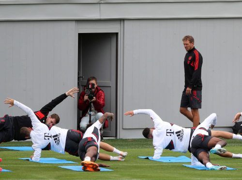 Jetzt geht es auch wieder auf dem Rasen zur Sache: Nachdem die ersten Bayern-Profis am Wochenende ihre obligatorischen Medizin- und Leistungstests absolviert hatten, bat Trainer Julian Nagelsmann (34) seine Spieler am Montag um 10 Uhr auf den Trainingsplatz. Bouna Sarr (30/Knie) fehlte. Von den namh