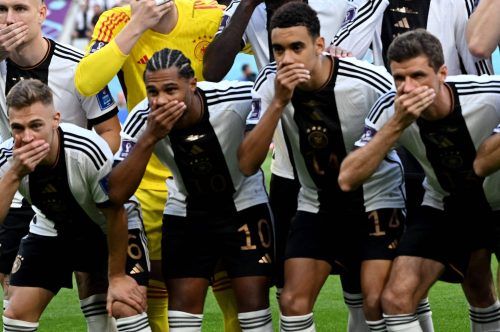 Der FC Bayern tritt zum traditionellen Trainingslager in Doha an. Am Flughafen sehr aufmerksame Begrüßung vor allem der Münchner Nationalspieler durch die Einheimischen. Sie halten sich mit der rechten Hand den Mund zu und winken fröhlich mit der linken.