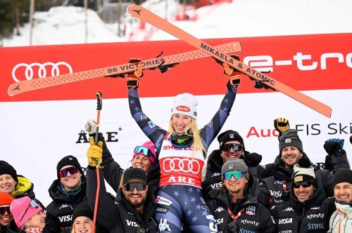 Are – Mikaela Shiffrin schlug nach ihrer Rekordfahrt in die Geschichtsbücher ungläubig die Hände auf ihren Helm, dann nahm die überwältigte Ski-Königin die Huldigungen ihrer abgehängten Konkurrentinnen entgegen. Mit ihrem 86. Weltcup-Sieg stellte Shiffrin die 34 Jahre alte Bestmarke von Ingemar Sten