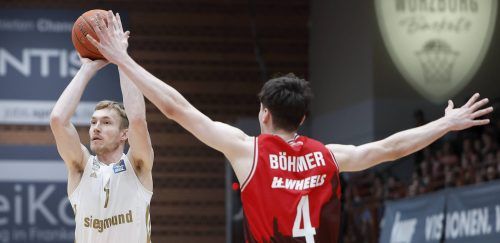 Mit guter Sicht auf den Korb und zu spät heraneilenden Verteidigern – so wirf es sich am besten. Niels Giffey (l.) kam beim Gastspiel der Bayern Basketballer bei den Würzburg Baskets einige Male in diesen Genuss. Insgesamt 13 Punkte erzielte er beim 67:49-Sieg der Münchner. „Es tut uns gut, wenn vie