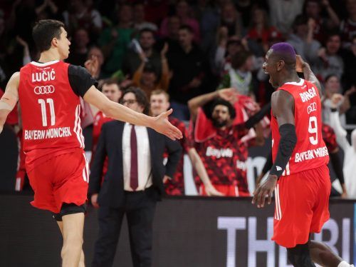 Der FC Bayern hat eine Niederlage gegen den früheren Serienmeister Brose Bamberg in der Basketball-Bundesliga erst im letzten Moment abgewendet: Ein Dreipunktewurf von Vladimir Lucic (links, hier mit Bonga) eine Sekunde vor dem Ende brachte dem Team von Trainer Andrea Trinchieri am Sonntag den 73:72