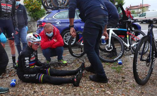 Salerno – Erst ein schmerzhafter Sturz wegen eines Hundes, dann ein weiterer Crash kurz vor dem Ziel: Der bislang so souveräne Rad-Weltmeister Remco Evenepoel ist auf der verregneten fünften Etappe beim Giro d’Italia zweimal hart zu Boden gegangen, erreichte aber offenbar ohne größere Verletzungen d