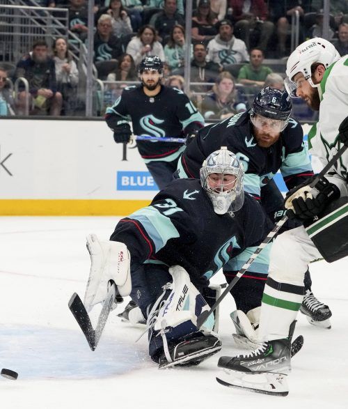 Eishockey-Nationaltorhüter Philipp Grubauer (Nummer 31) und die Seattle Kraken haben im Playoff-Viertelfinale der nordamerikanischen Profiliga NHL ein siebtes Spiel erzwungen. Das Team um den deutschen Goalie gewann sein Heimspiel gegen die Dal