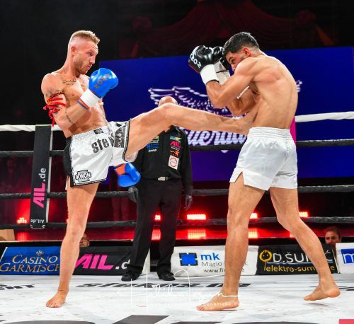Der Weltmeisterschaftskampf bis 70 kg im Thaiboxen bei Stekos Fight Night im Circus Krone war schnell vorbei. Der Bremerhavener Pascal Schroth (l.) ließ dem Afghanen Mohammad Mazlumiar keine Chance. Verbissen haben beide Kämpfer angefangen. Es war ein ausgeglichener Kampf mit leichten Vorteilen für