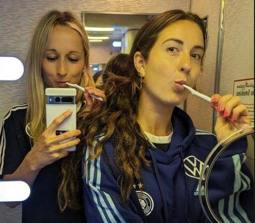 Nach dem Start in Frankfurt (Bild links) versuchten die DFB-Frauen in den langen Stunden über den Wolken und auf der Zwischenstation in Dubai (rechts), sich irgendwie die Zeit zu vertreiben. Martina Voss-Tecklenburg feilte derweil an den letzten Details ihrer „tierischen“ WM-Pläne. „Wir möchten gera