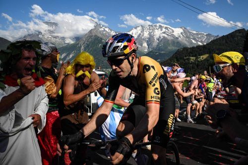Als das Fan-Chaos bei der Tour de France seinen Tiefpunkt erreichte, meldete sich auch der Mann im Gelben Trikot zu Wort: „Es ist schon ein Problem“, befand Titelverteidiger Jonas Vingegaard (in großen Bild hinter Pogacar): „Die Zuschauer müssen sich einfach nett verhalten und nicht auf der Straße s