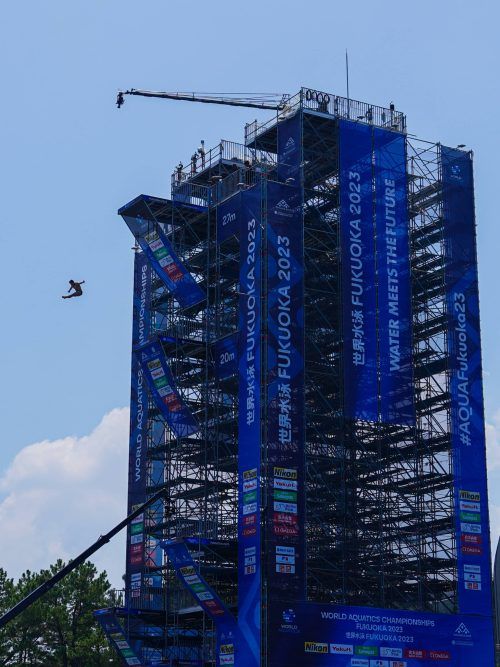 Klippenspringer Manuel Halbisch hat bei seiner WM-Premiere die eigenen Erwartungen erfüllt. „Ich bin mehr als zufrieden“, sagte der 25-Jährige aus Waiblingen nach Rang 18 im Momochi Seaside Park in Fukuoka. Für seine vier Sprünge aus 27 m Höhe erhielt Halbisch (am großen Bild rechts in Aktion) 246,0