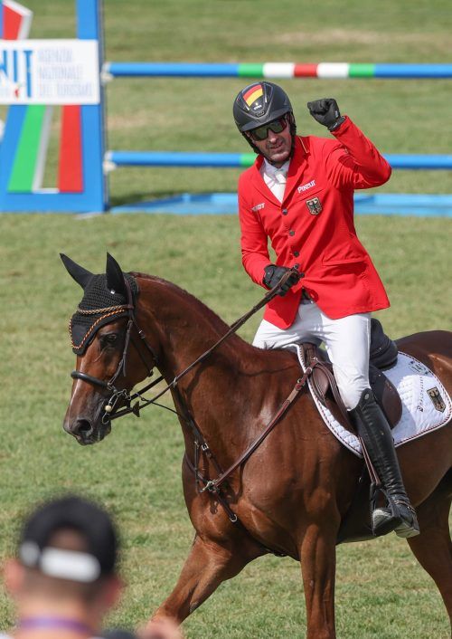 Mailand – Philipp Weishaupt und Sieger Steve Guerdat standen in der Anlage San Siro Arm in Arm auf dem Podium, beide streckten den Daumen nach oben, ehe sie sich freudestrahlend gegenseitig mit Sekt duschten. Danach feierte Weishaupt seine erste EM-Medaille mit seinen Teamkollegen – und noch wichtig