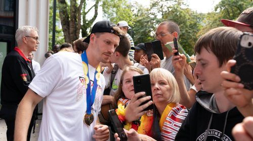 Bayern-Fans bereiten ihren drei Weltmeistern einen stürmischen Empfang im BMW-Park