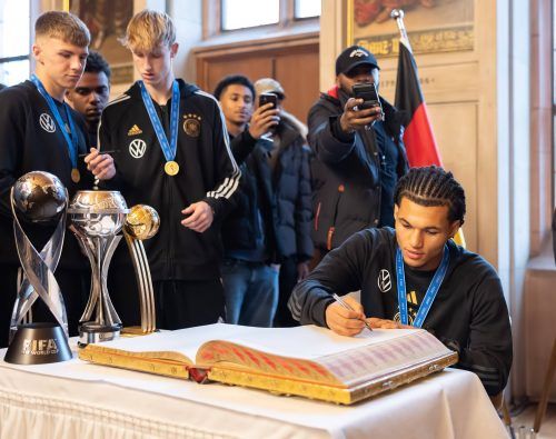 Mit dem silbernen Pokal in den Händen, den goldenen Medaillen stolz um den Hals betraten Kapitän Noah Darvich (großes Bild) und all die anderen umjubelten WM-Helden nach ihrem Sensations-Coup die Bühne am Frankfurter DFB-Campus. Unter dem Applaus von zahlreichen Mitarbeitern, Freunden und Familien w