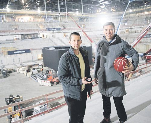 EHC- und FCBB-Ikonen Michael Wolf und Steffen Hamann auf der Baustelle des SAP Gardens