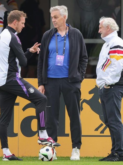 Meinungsaustausch auf großer Ebene: Gordon Herbert (Mitte) mit DFB-Kollege Julian Nagelsmann und DFB-Sportdirektor Rudi Völler. © dpa/Charisius