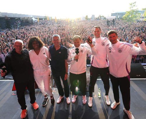 Abwechslung: Thomas Müller (1.v.r.) und Manuel Neuer waren beim „Three Stripes Festival“ mit Herbert Hainer (3.v.l.) & Co. auf der Bühne. © DFB