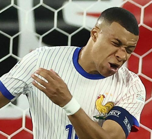 Das sieht nicht gut aus: Kylian Mbappe prallte gegen Österreichs Kevin Danso, die Nase musste aber nicht operiert, sondern nur gerichtet werden. Nun wird eine Spezialmaske angefertigt. © DPA