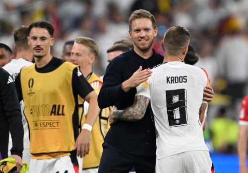 Erleichtert, dass sich das Risiko ausgezahlt hat: Bundestrainer Julian Nagelsmann (M) umarmt Toni Kroos. © Gambarini/dpa
