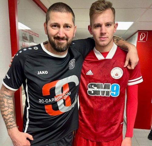 Wenn der Vater mit dem Sohne: Sascha Mölders mit Filius Noah, dem Kapitän des SV Mering II. © Thomas Ernstberger
