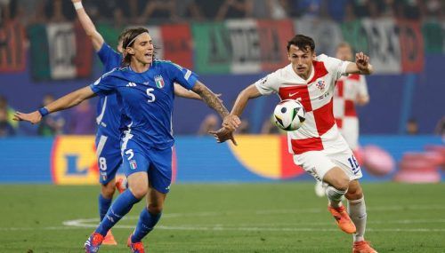 Der Umschwärmte packt zu: Riccardo Calafiori (li.), hier gegen Kroatien. © Andersen / AFP