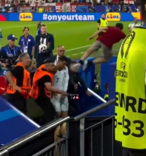 Mit einem Sprung von der Tribüne in Richtung Superstar Cristiano Ronaldo hat ein Fan für einen Schreckmoment bei der Fußball-EM gesorgt. Nach der 0:2-Niederlage Portugals gegen Georgien befand sich Ronaldo in Gelsenkirchen gerade auf dem Weg vom Spielfeld Richtung Spielertunnel, als plötzlich ein An