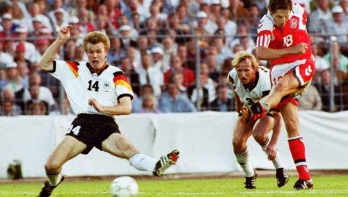 Schwer zu packen: Gegen Flemming Povlsenund Co. hatte die DFB-Elf um Helmer 1992 einen schweren Stand. © Imago
