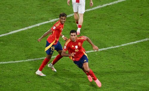 Sein Tor brachte die Wende: Spaniens Rodri bejubelt seinen Treffer zum 1:1 – Jungstar Lamine Yamal freut sich mit ihm, auch er machte erneut ein starkes Spiel. © dpa /