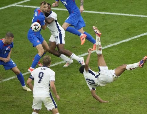 Traumtor: Jude Bellingham bei seinem Fallrückzieher in der Nachspielzeit, der England in die Verlängerung rettet. © dpa