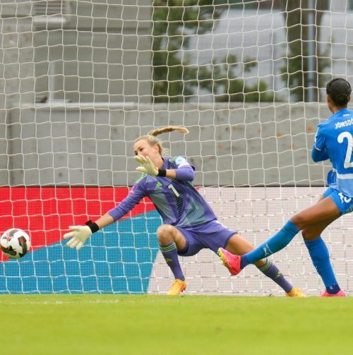 Einer von drei Gegentreffern: Frohms war gegen Jonsdottir chancenlos. © Gunnarsson/dpa