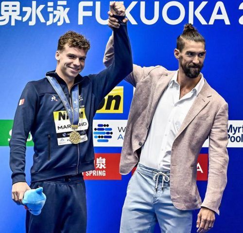 Schätzen sich sehr: Die beiden Schwimm-Superstars Leon Marchand (l.) und Michael Phelps (r.). © IMAGO