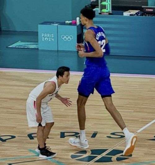 Groß gegen klein: Frankreichs Victor Wembanyama (2,22 Meter) gegen den Japaner Yuki Togashi (1,67 Meter). © Instagram, Conroy/dpa, Al-do