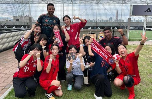Frau Lee lebt für den FC Bayern: Red Light Korea samt der Fanclub-Vorsitzenden beim Legendenmatch mit Pizarro und Elber. © FCB