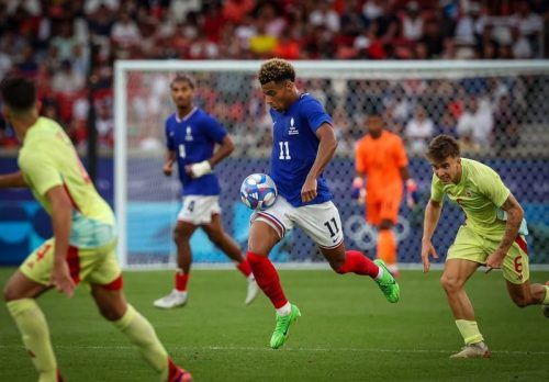 Sein Weg führt nicht nach München: Désiré Doué (Mi.) spielte mit Frankreich bei Olympia und wechselt wohl zu PSG. © IMAGO